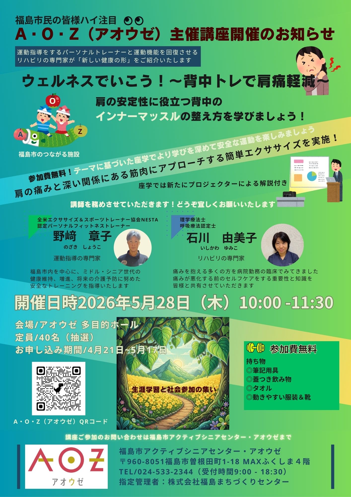 運動指導をするトレーナーと運動器機能を回復させるリハビリの専門家で「新しい健康の形」をご案内いたします。福島市アオウゼ主催講座のテーマーは、【ウェルネスでいこう!~背中トレで肩痛軽減~】肩の安定性に役立つ背中のインナーマッスルの整え方を学びましょう!肩の痛みと深い関係にある筋肉にアプローチする安全で楽しいエクササイズを皆様と共有させていただきます。