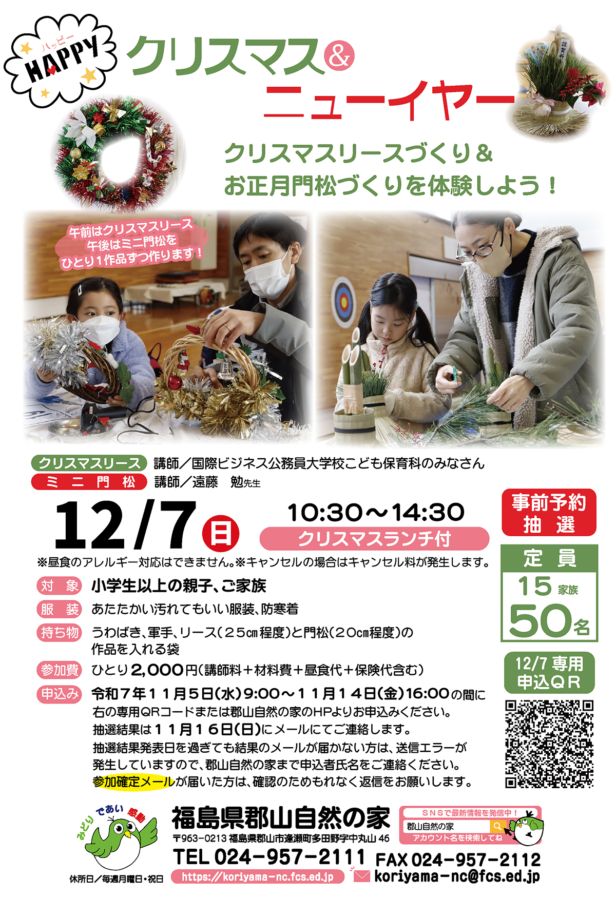 クリスマスリースづくり&お正月門松づくりを体験しよう! 午前はクリスマスリースを午後はミニ門松をひとり1作品ずつ作ります。