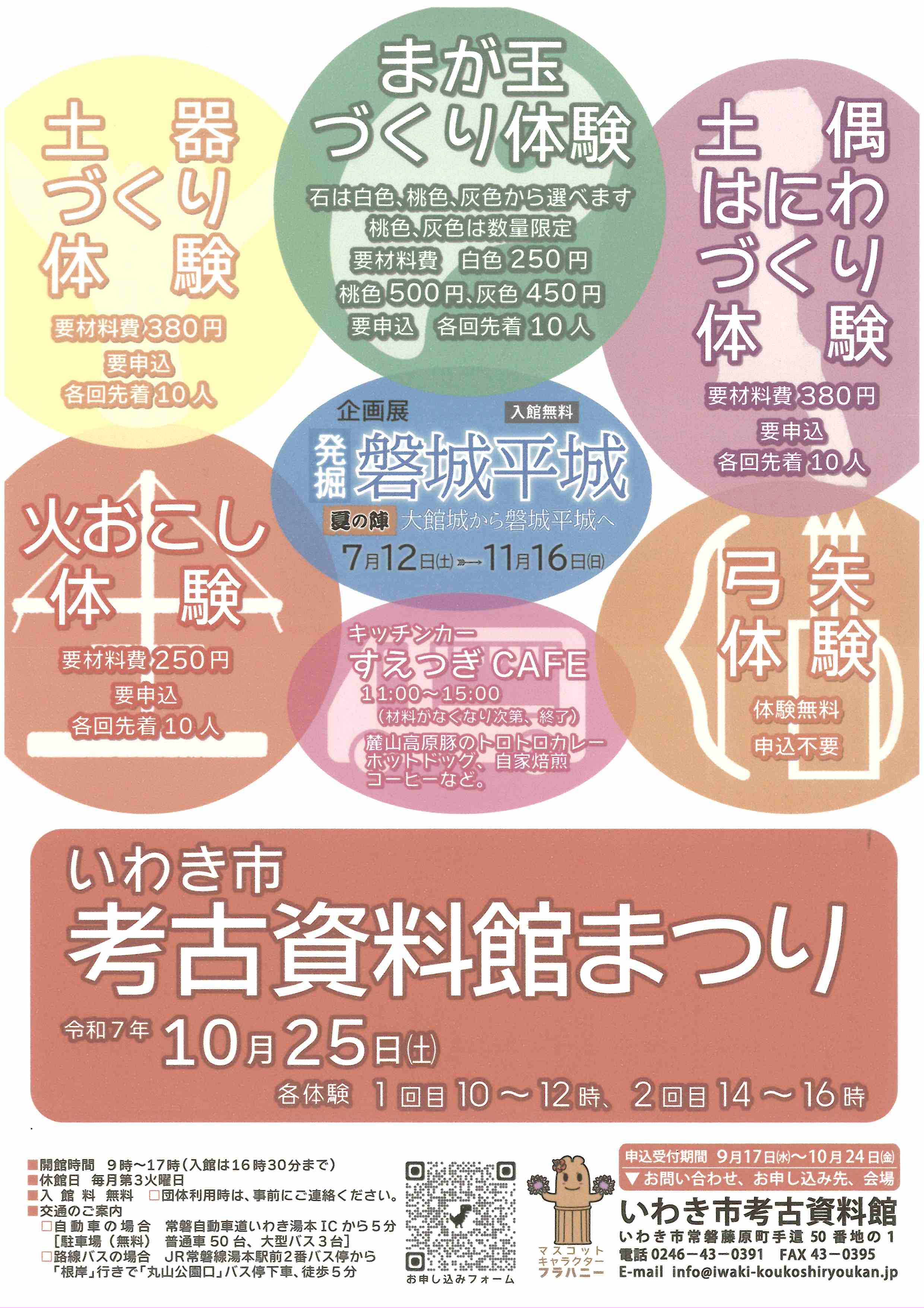 まが玉づくり、土器・土偶・はにわづくり、火おこし、弓矢体験。