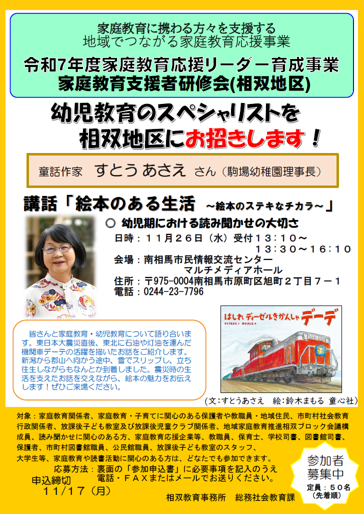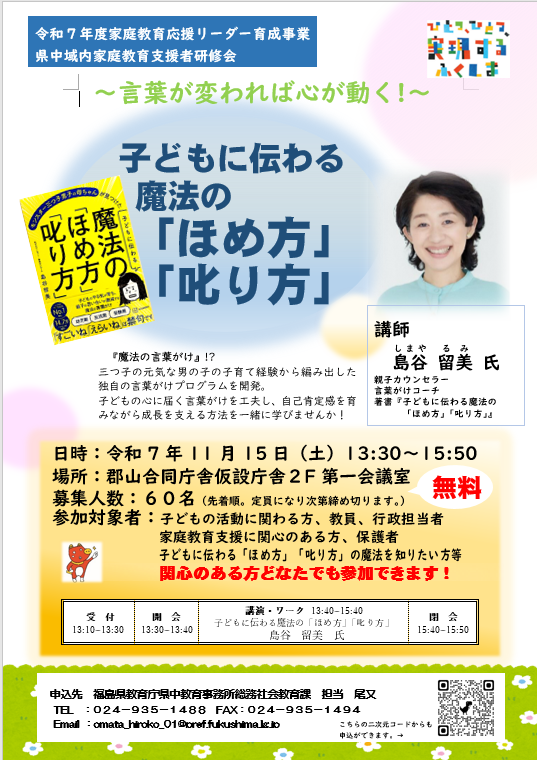福島県地域家庭教育推進協議会や相双ブロック会議を受け、現代的課題、県や地域の課題を把握し、地域の実態に応じた研修を行う。このことにより、家庭教育について親自身の学ぶ機会が充実するよう支援するとともに、地域で子育てをする親の支援者(家庭教育支援者)の実践力を高める。