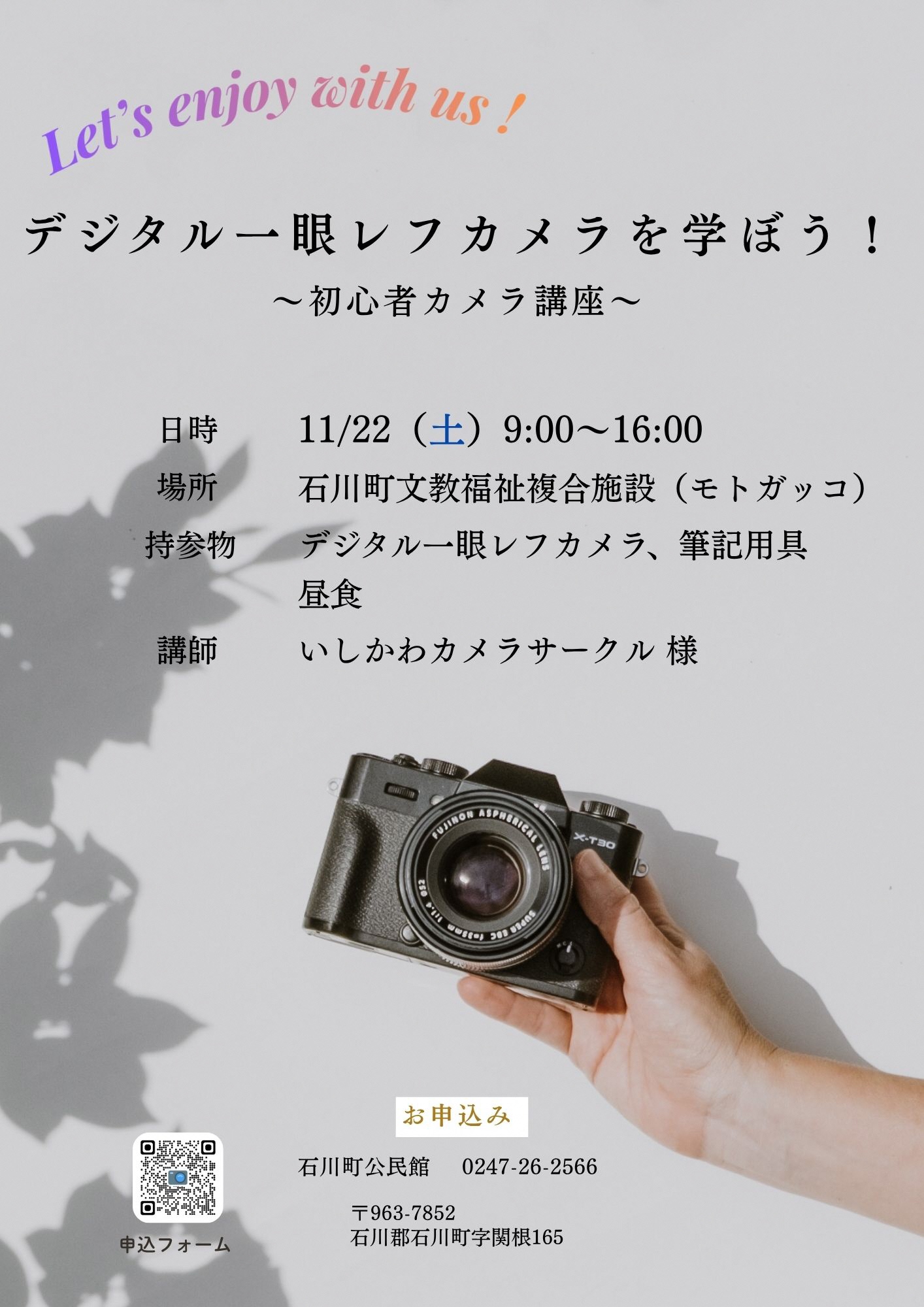 デジタル一眼レフカメラで、ワンランク上の写真を撮影したい方向けの短期集中講座です。 講師として、いしかわカメラサークルの方にお越しいただきます。12月頃には、講座内で撮影した写真の展示会も予定しています。 写真撮影をスキルアップさせたい方は、ぜひ、ご参加ください♪