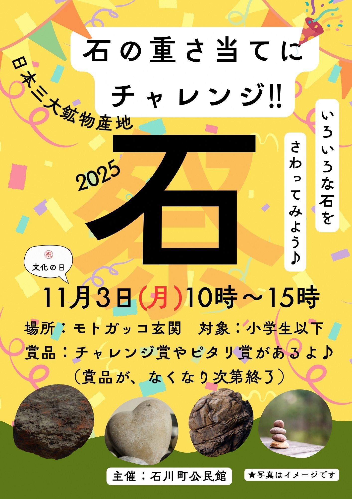 モトガッコで、いろいろな石をさわってみよう!! どのくらいの重さかな♪チャレンジ賞やピタリ賞があるよ♪ 11/(土)~11/3(月)は、モトガッコで文化祭の一般作品展が開催されています。ぜひお立ち寄りください♪