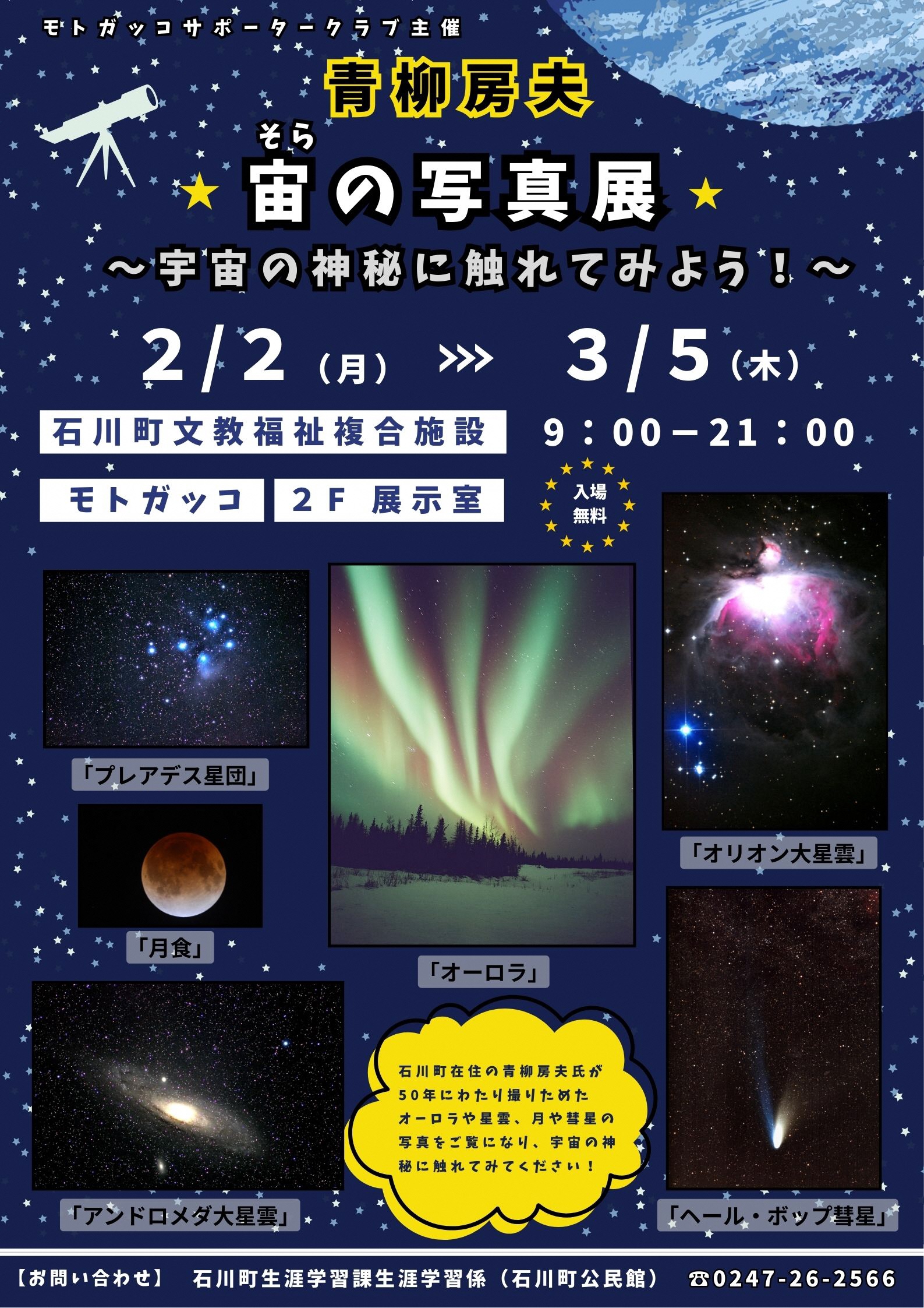 石川町在住の青柳房夫氏が50年にわたり撮りためたオーロラや月の写真をご覧になり、宇宙の神秘に触れてみませんか♪ 3月3日の皆既月食を楽しむヒントになるかもしれませんよ♪
