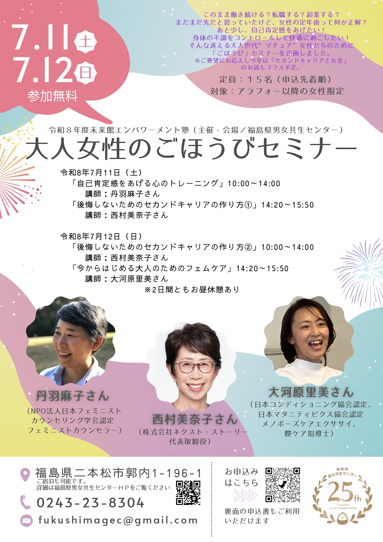 アラフォー以降のマチュア世代(マチュア=シニアより若く、成熟した大人の女性に多く使われる言葉)の女性が、自己肯定感を持ち、自分を大切にしながら心身ともに健康に活躍し続けることができるよう、エンパワーするためのセミナーを実施する。