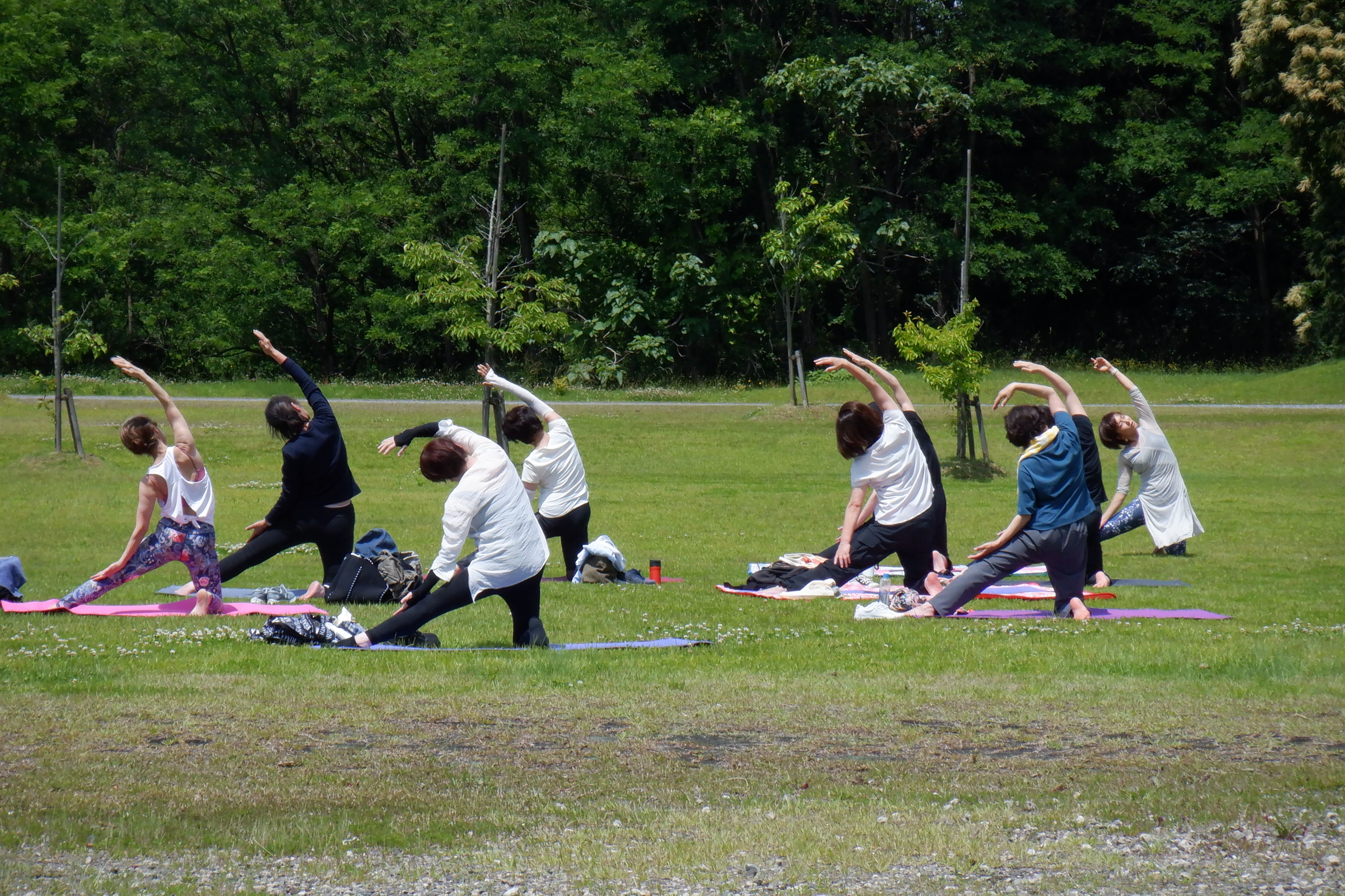 芝生の上で心と体をリラックスさせるヨーガ教室です。