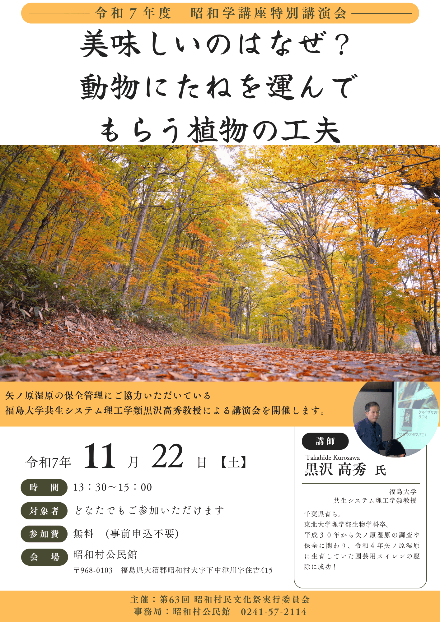 当日は、福島大学教授の黒沢高秀先生を講師にお招きし、「美味しいのはなぜ?動物にたねを運んでもらう植物の工夫」をテーマとした講演会を開催します。